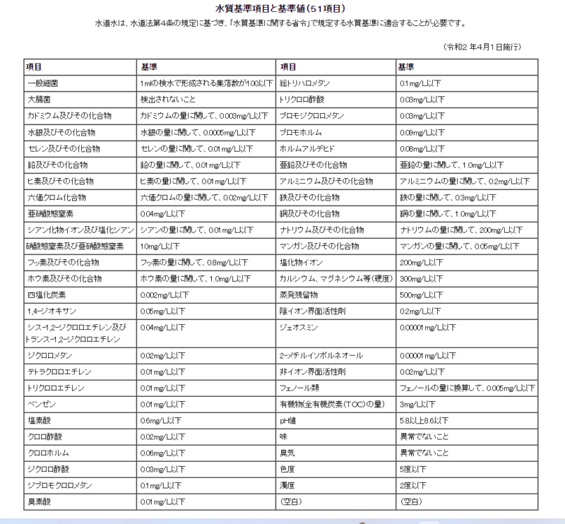 日本の水質基準は51種類の基準値を設定して検査をしています。